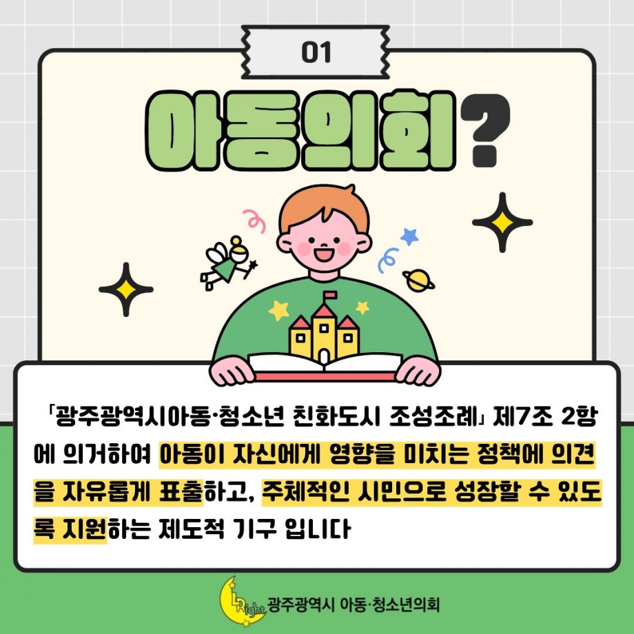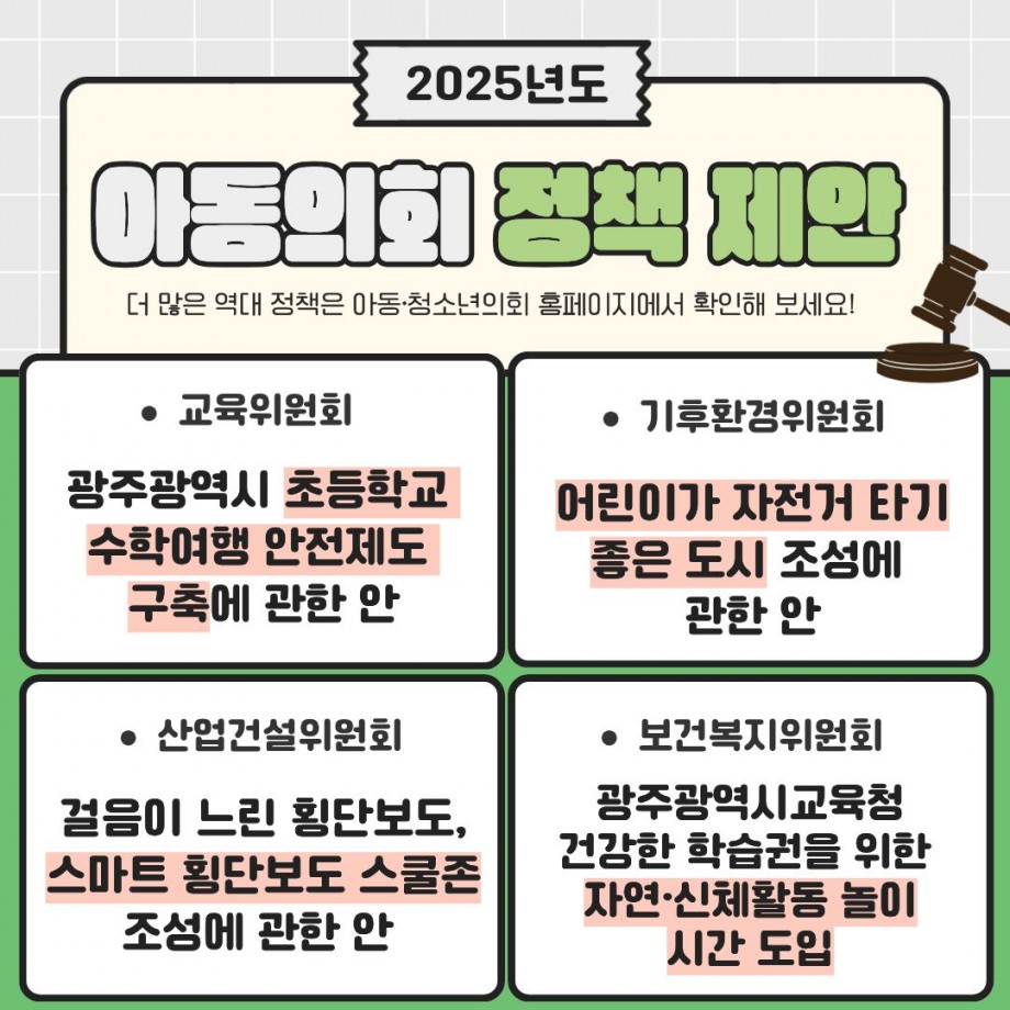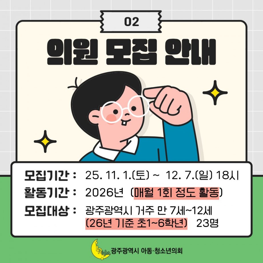광주광역시 아동을 대표하여 1년 동안 의원 활동을 할 초등학생을 모집합니다! ○ 모집기간: 2025.11.1.(토) ~ 12.7.(일) 18:00까지 ○ 모집대상: 광주광역시에 거주하는 만 7세~12세 아동 누구나 (2026년도 기준 초1~초6) ○ 모집인원: 광주광역시의회 구성과 동일하게 23명 ○ 신청방법: 아동청소년의회 홈페이지(gjchild.kr) 공지사항 신청서 작성 후 → 이메일 제출(gjcysimin@hanmail.net) ○ 주요활동 1) 매월 정례회의 및 정책제안서 작성 - 상임위원회 구성 : (25년 기준) 기후환경위원회, 교육위원회, 보건복지위원회, 산업건설위원회 - 운영위원회 구성 : 상임위별 위원장으로 구성 - 매월 정례회의를 통해 분과별 지역문제 발굴 및 정책제안서(조례안) 작성