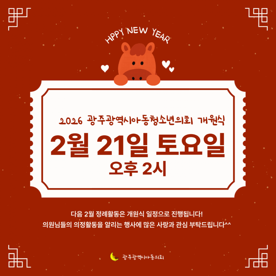 제6대 광주광역시아동의회 1월 정례활동 페이지 정보 작성자 관리자 댓글 0건 조회 47회 작성일 26-01-25 22:22 목록 본문 많은 관심과 사랑 부탁드립니다.감사합니다.^^ 이전글제10대 광주광역시청소년의회 1차 정례활동 26.01.27 다음글2026년 병오년 새해 복 많이 받으세요^^ 26.01.14