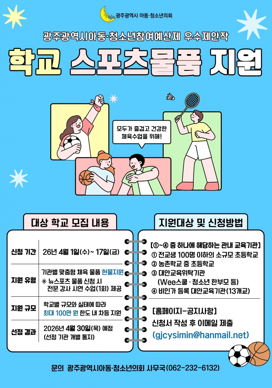- 2025 광주광역시아동·청소년참여예산제 우수제안작 - 스포츠 물품 지원사업 대상 학교 모집 | |||