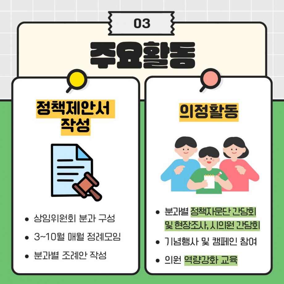 2) 의정활동 - 위촉식(1월), 개원식(2월), 본회의(11월), 의정성과보고회(12월) 필수 참석 ※의회 운영에 따라 해당 일정은 변경될 수 있습니다. - 의원 역량강화 교육(구의원 특강), 정책자문단 간담회, 시의원 간담회 - 캠페인 활동(지구의날 기념행사, 518민주대행진, 아동친화도시상위인증선포식 등) 참여
