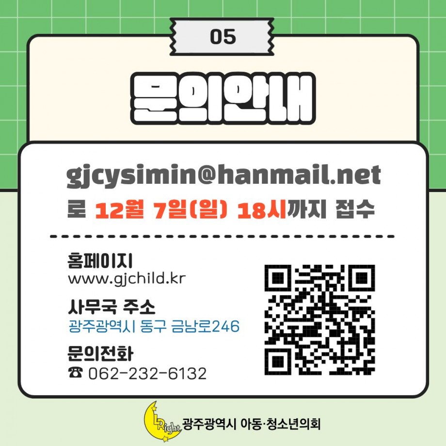 아동의원 활동에 대한 기타 문의사항은 사무국(062-232-6132)으로 연락 주세요! 많은 신청 부탁드립니다~^^ |