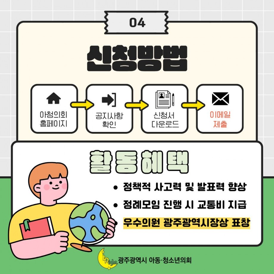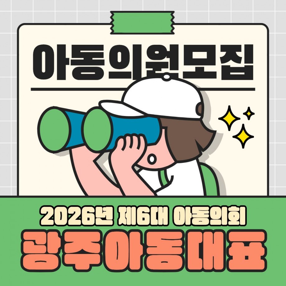 광주광역시 아동을 대표하여 1년 동안 의원 활동을 할 초등학생을 모집합니다! ○ 모집기간: 2025.11.1.(토) ~ 12.7.(일) 18:00까지 ○ 모집대상: 광주광역시에 거주하는 만 7세~12세 아동 누구나 (2026년도 기준 초1~초6) ○ 모집인원: 광주광역시의회 구성과 동일하게 23명 ○ 신청방법: 아동청소년의회 홈페이지(gjchild.kr) 공지사항 신청서 작성 후 → 이메일 제출(gjcysimin@hanmail.net) ○ 주요활동 1) 매월 정례회의 및 정책제안서 작성 - 상임위원회 구성 : (25년 기준) 기후환경위원회, 교육위원회, 보건복지위원회, 산업건설위원회 - 운영위원회 구성 : 상임위별 위원장으로 구성 - 매월 정례회의를 통해 분과별 지역문제 발굴 및 정책제안서(조례안) 작성